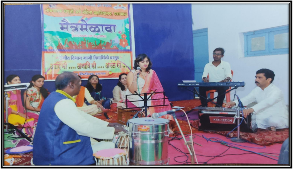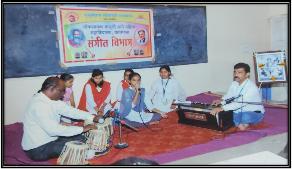 महाविद्यालयाच्या स्थापनेपासूनच पदिी स्तरािर संगीत हा विषय शिकविला जातो. सत्र 2003 - 2004 पासून पदव्युत्तर विभाग सुरू करण्यात आला ि यितमाळ जजल्ह्यात संगीत विषयात एम. ए .असलेले आमचे एकमेि महाविद्यालय आहे. अनेक विद्यार्थिनींना गुणित्ता यादीत स्थान प्राप्त झाले असून सुिणि पदकाने सन्माननत करण्यात आले आहे. विद्यार्थिनींसाठी दरिषी सुगम संगीत िगि,ब्रिज कोसि चे आयोजन करण्यात येते. विभागाच्या माजी विद्यार्थिनी संगीत क्लास, मंचप्रदििन,संगीत शिक्षक या माध्यमातून संगीत क्षेत्रात कायिरत आहेत. विभागाद्िारे यु. जी.सी.पुरस्कृत दोन राष्ट्रीय चचािसत्रांचे आयोजन करण्यात आले,तयांच्या दोन िोधननबंध पुजस्तकांचे प्रकािनही याप्रसंगी करण्यात आले. पंडित हृदयनाथ मंगेिकर ,पंडित राहुल देिपांिे ,पंडित विकास किाळकर, राजदत्त यासारख्या सुप्रशसद्ध व्यक्तींनी संगीत विभागाला भेट देऊन विद्यार्थिनींचे कौतुक केले आहे.